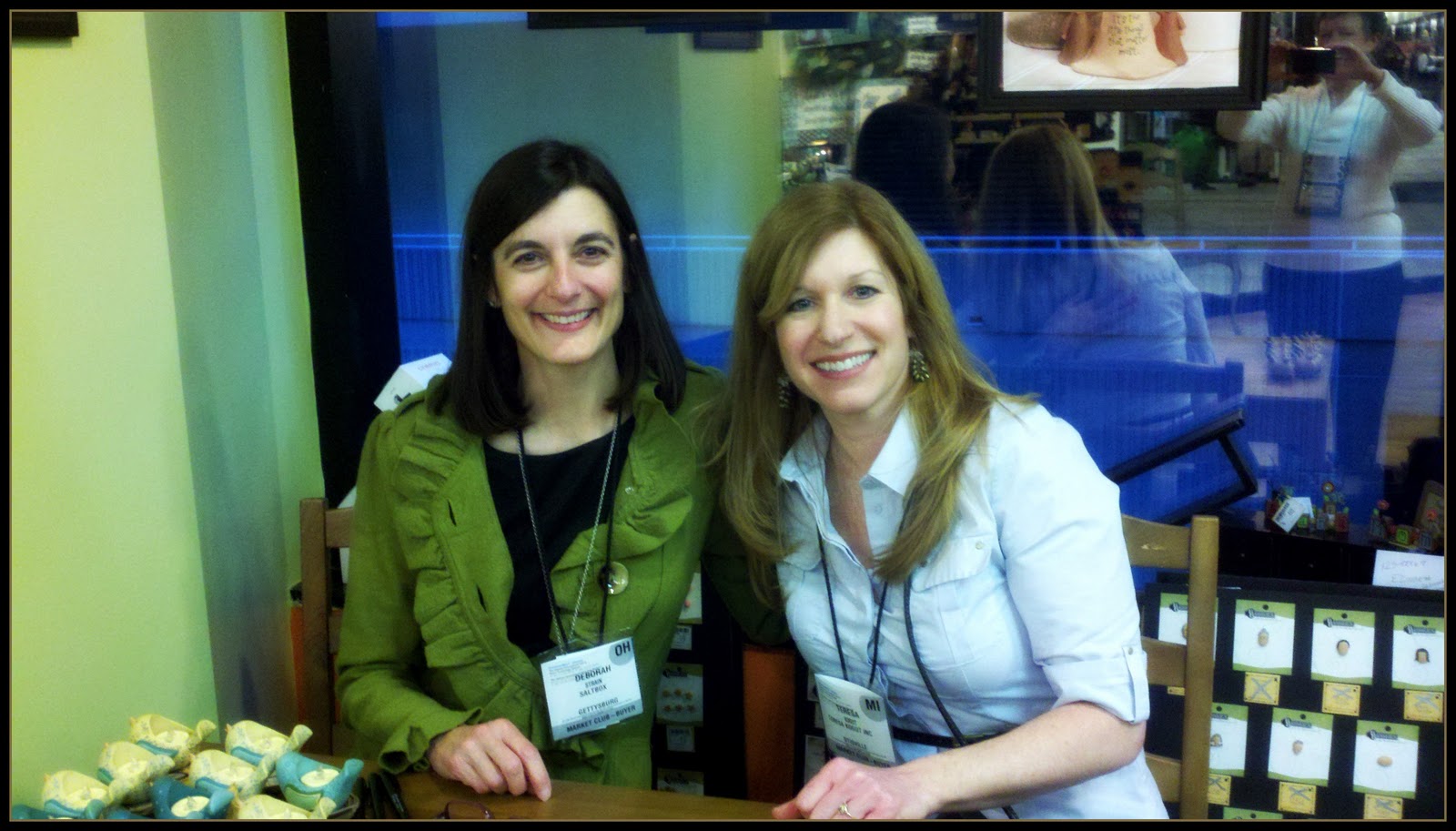 Deb Strain and Me in Blossom Bucket’s showroom for a signing (and Beth’s reflection in the window)