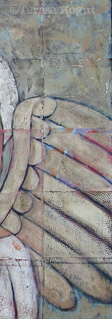 These three images are closeups of the angel pictured below. I really love all the texture in this painting and thought you might like to see it too. Many layers go into a painting like this….collage papers, layers of acrylic paints, (then I sand the painting to let some of the color from the collage papers show through) a layer gloss varnish, crackle medium, a raw umber wash, then I seal it with two layers of matte varnish. All these steps are worth the end result πŸ™‚
