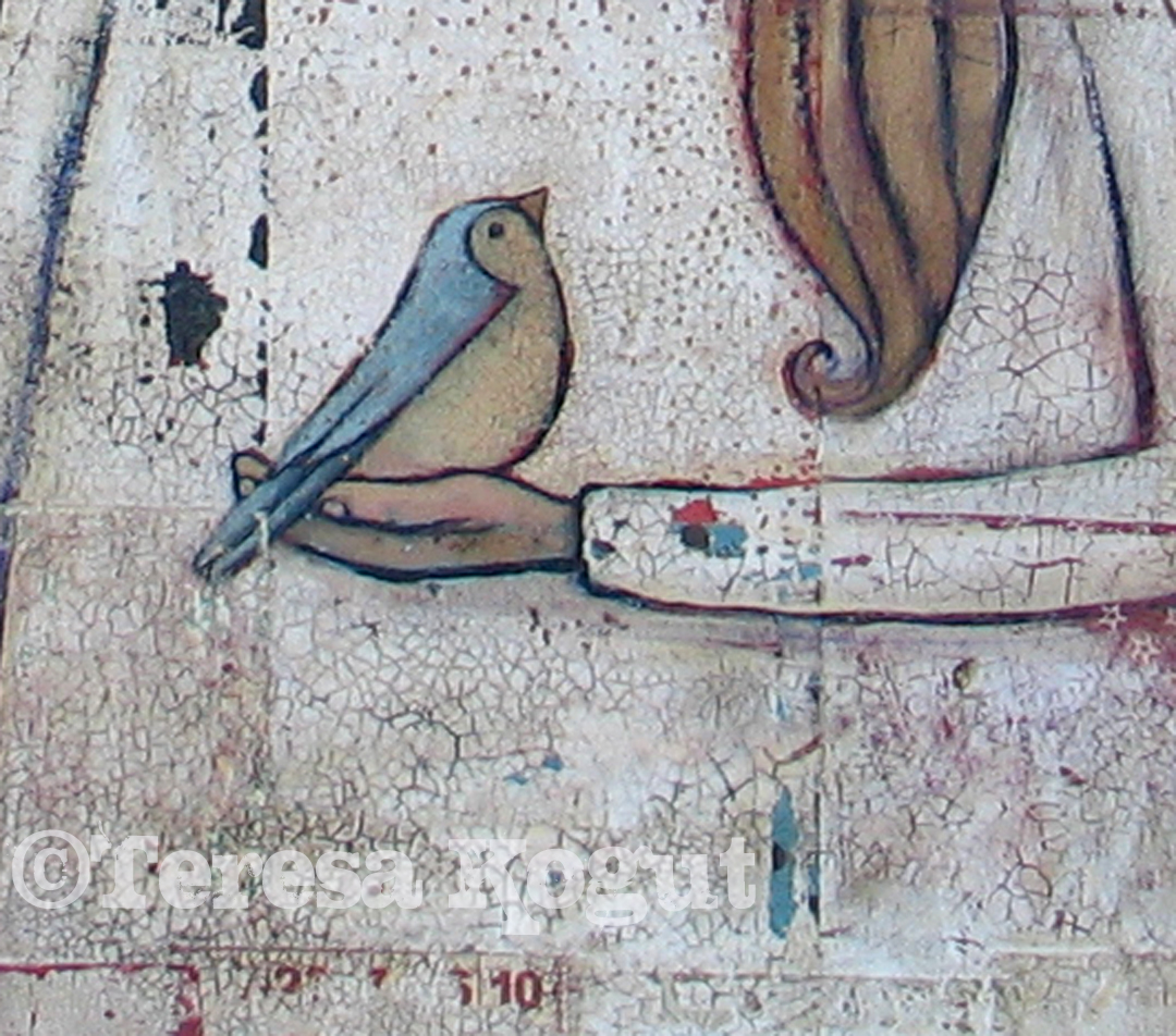 These three images are closeups of the angel pictured below. I really love all the texture in this painting and thought you might like to see it too. Many layers go into a painting like this….collage papers, layers of acrylic paints, (then I sand the painting to let some of the color from the collage papers show through) a layer gloss varnish, crackle medium, a raw umber wash, then I seal it with two layers of matte varnish. All these steps are worth the end result πŸ™‚